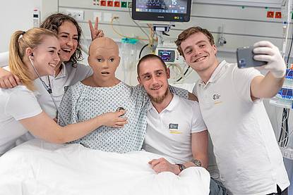 Schon ab dem ersten Semester lernen und üben Studierende die für den beruflichen Alltag notwendigen Fertigkeiten. Studiengangsleiterin Bettina Madleitner und die Studienbereichsleiter*innen Daniela Vitek, Hans Peter Köllner sowie Johanna Binder geben Einblicke in die bestens ausgestatteten Funktionsräume und verschiedene Fertigkeitentrainings. Noch Fragen?