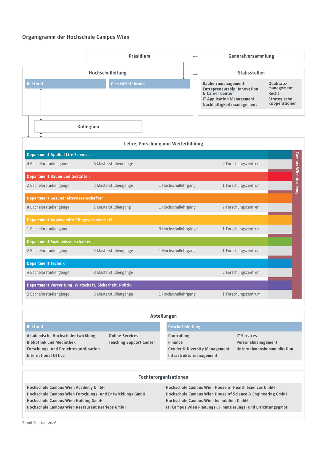 Die Hochschule Campus Wien (HCW) besteht aus Hochschulleitung, Departments mit den jeweiligen Studienprogrammen und Abteilungen. Zusätzlich sind Tocherunternehmen für Forschung und Entwicklung, Weiterbildung, Infrastruktur und Gastronomie etabliert.