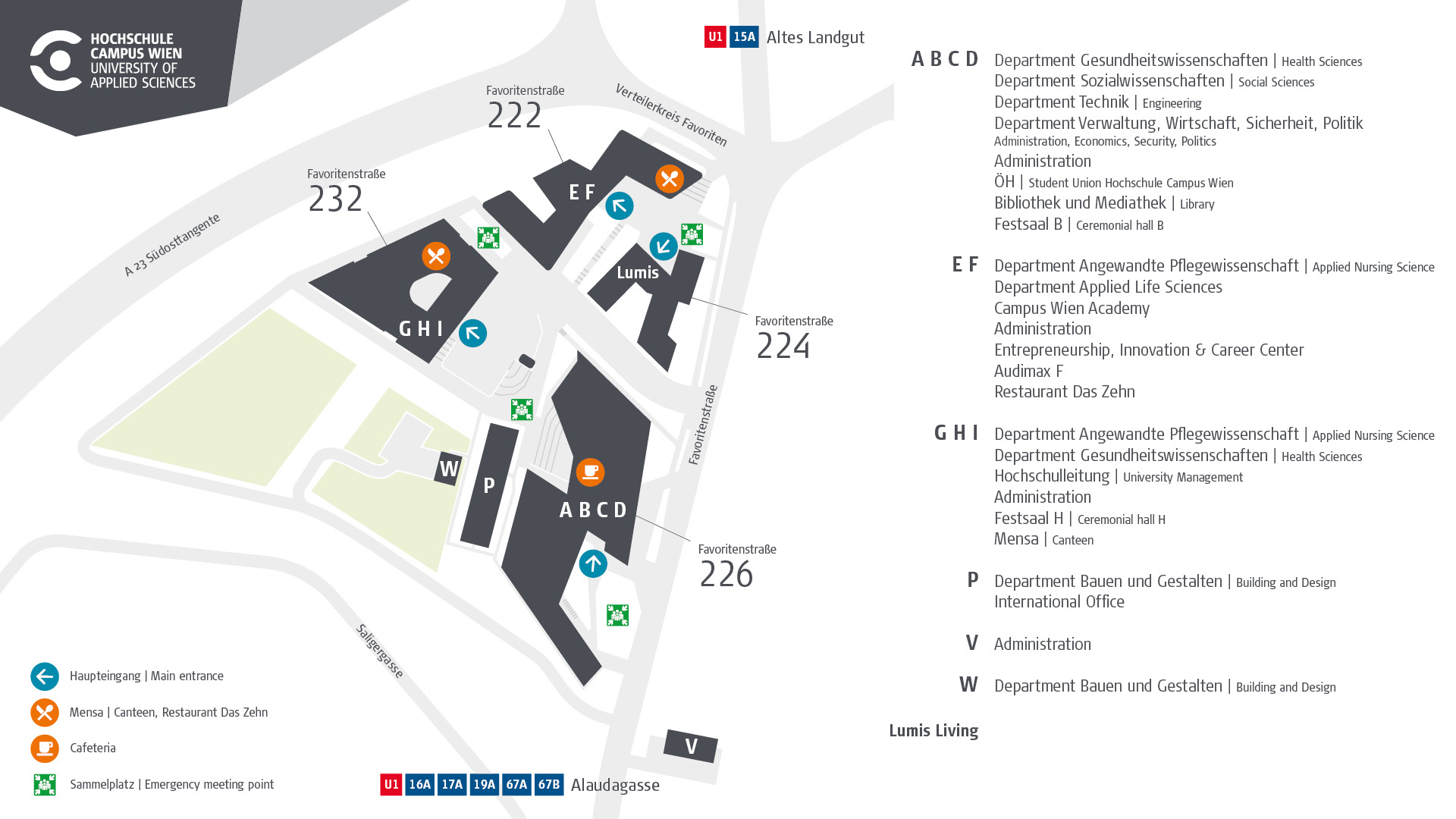 The nearby subway line U1 and bus 15A (Altes Landgut station) perfectly connect Hochschule Campus Wien to Vienna‘s public transport network and the international main railway station. Located just next to the Vienna Favoriten interchange roundabout („Favoriten Verteilerkreis“) good accessibility by private transport is guaranteed as well.
