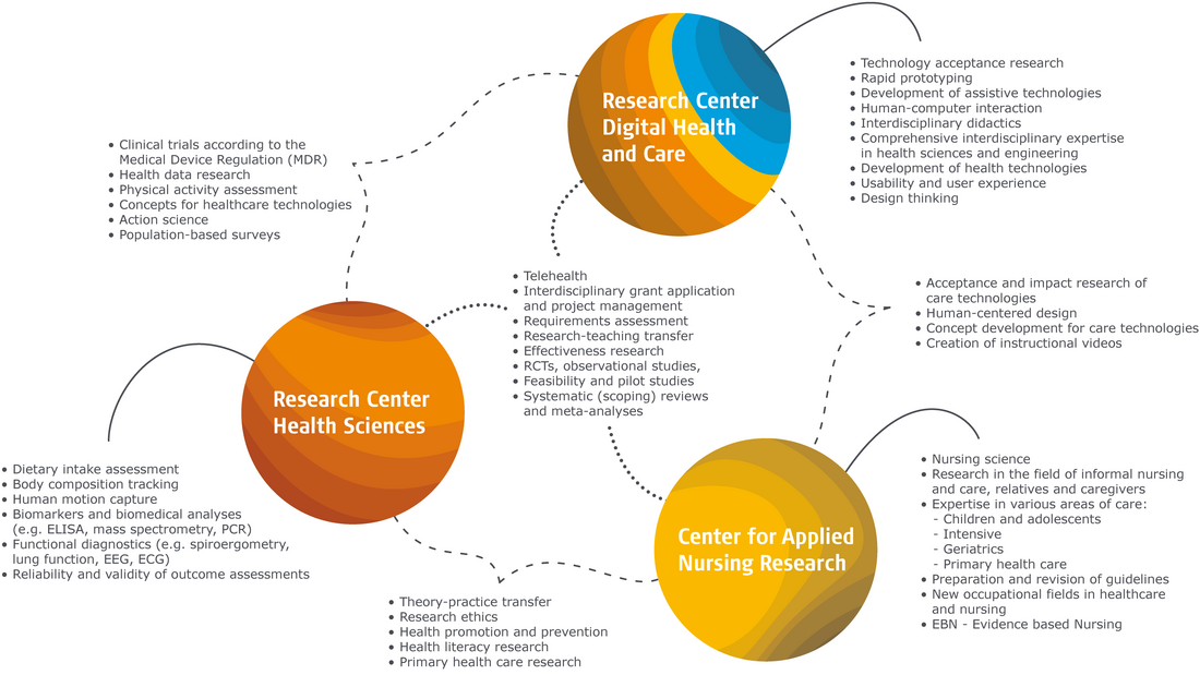 The interprofessional Research Center Health Sciences (formerly INDICATION) investigates the efficacy of therapeutic applications, the validity of diagnostic assessments, and the evidence base of research questions in the health sciences. We conduct research and development in the fields of movement science, biomedical research, health literacy, and assess food consumption and physical activity.