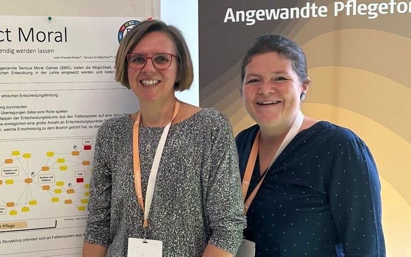 Elisabeth Kupka-Klepsch, Forschende im Zentrum für Angewandte Pflegeforschung und Tamara Großbilchler, hauptberuflich Lehrende im Bachelorstudiengang Gesundheits- und Krankenpflege, stellten das Projekt beim „Markt der Möglichkeiten“ vor. „Dieses Ausstellungsformat ermöglichte uns, neben zwei moderierten Präsentationen, viele Gespräche mit interessierten Personen aus verschiedensten Gesundheitsbereichen zu führen“, zeigten sich die beiden begeistert. Das rege Interesse der Teilnehmer*innen nutzten die Lehrenden und Forschenden ganz nach dem Motto – aus der Praxis für die Praxis – für eine Umfrage. Dabei konnte für Dilemmata gevotet werden und auch die eigenen Ideen für Dilemmata aus dem Pflegesetting der Kongressteilnehmenden erwiesen sich als sehr inspirierend.