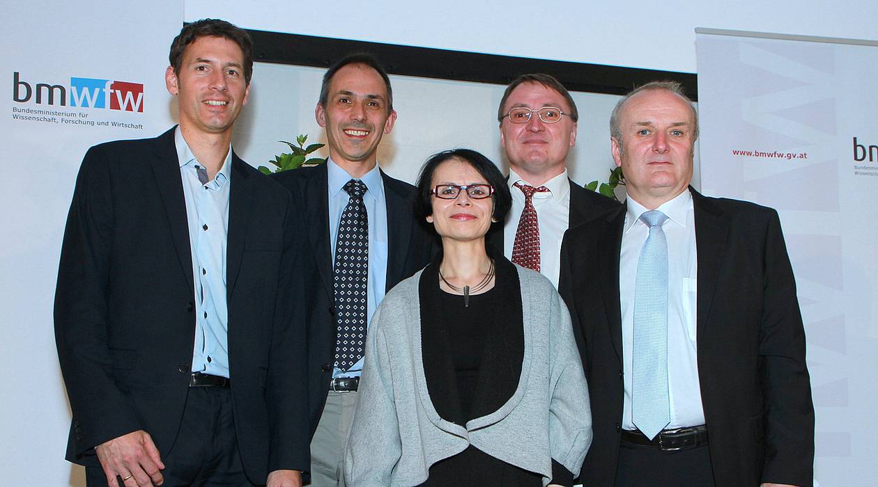 Monika Frauwallner, DI Franz Gatterer, MBA, Dr. Georg Hruschka, Dr. Timo Kretzschmar, Ing. Michael Szkutta und Dr. Hans Kurz zeichnen verantwortlich für die "Entwicklung und Implementierung eines innovativen, fächerübergreifenden, kompetenzorientierten Prüfungskonzeptes für das Bachelorstudium Molekulare Biotechnologie", wie das erfolgreiche Projekt heißt.