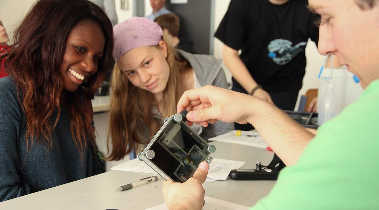 SchülerInnen der AHS Wenzgasse beim Experimentieren mit dem von Festo entwickelten "BionicLab" © Festo / Georg Krewenka