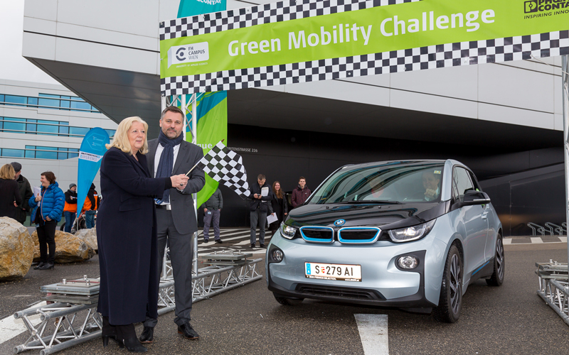 Um Elektromobilität hautnah zu erleben, fand am 16.3.2016 die erste Green Mobility Challenge der FH Campus Wien statt - eine Gleichmäßigkeitsfahrt mit Elektrofahrzeugen von Wien nach Baden und retour. Zweierteams von Studierenden, Lehrenden und KooperationspartnerInnen aus dem automotiven Umfeld gingen mit 17 Fahrzeugen der Modelle BMW i3, VW e-Golf, Mitsubishi iMiev, Nissan Leaf, Renault Zoe und Tesla Model S an den Start. Nach einer morgendlichen FahrerInnenbesprechung durch FH-Prof. DI Andreas Petz, Studiengangsleiter Green Mobility, und einer Einweisung in die Elektrofahrzeuge fand die offizielle Eröffnung der Green Mobility Challenge statt. Die Bezirksvorsteherin des 10. Wiener Gemeindebezirks, Hermine Mospointner, eröffnete die Veranstaltung gemeinsam mit Dipl.-Ing. Dr.mont. Heimo Sandtner, Vizerektor für Forschung und Entwicklung der FH Campus Wien.