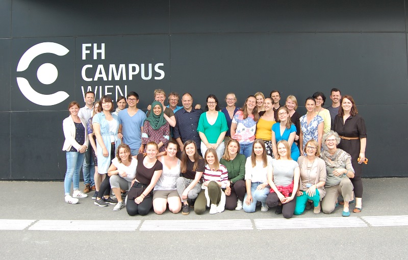(c) Grundtner Stefan. Gruppenbild der FAB-Studierenden vor dem Gebäude der Hochschule Campus Wien.