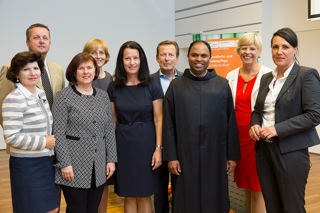 Bildmitte: Dr.in Roswitha Engel, Departmentleitung Pflegewissenschaft, rechts: Pater Prior Saji Mullankuhzy OH, links: Mag.a Barbara Zinka, Schuldirektorin (beide Barmherzige Brüder Wien) mit Hochschulleitung der Hochschule Campus Wien und AusbildungspartnerInnen (c) Hochschule Campus Wien