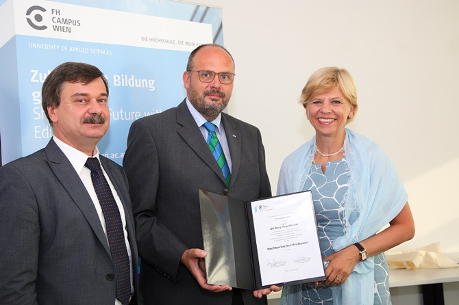 v.l.n.r.: Departmentleiter Technik Andreas Posch, Jörg Pogatscher, Rektorin Barbara Bittner © FH Campus Wien / Schedl