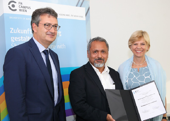 v.l.n.r.: Studiengangsleiter Gerold Unterhumer, Godoberto Guevara Rojas, Rektorin Barbara Bittner © FH Campus Wien/ Schedl