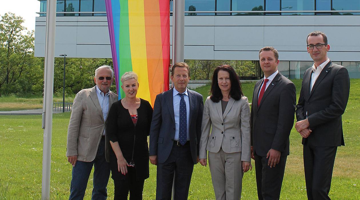 Gehisst wurde sie im Beisein der Hochschulleitung - Roswitha Engel, Vizerektorin für Lehre, Heimo Sandtner, Vizerektor für Forschung und Entwicklung, Wilhelm Behensky, Vorsitzender der Geschäftsleitung, Horst Rode, Geschäftsführer und CFO sowie Manfred Teiner, Geschäftsführer. Ulrike Alker, Leiterin der Abteilung Gender & Diversity Management, war ebenfalls anwesend.
