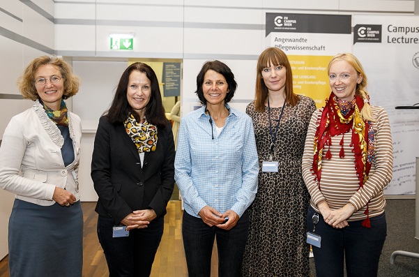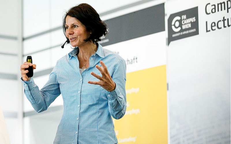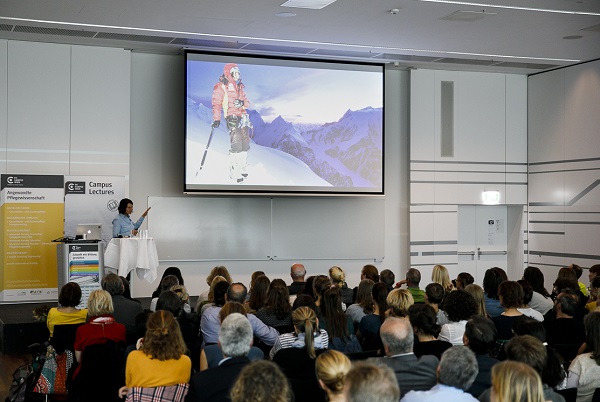 Auf Einladung vom Department für Angewandte Pflegewissenschaft brachte Gerlinde Kaltenbrunner am 10. Oktober Gipfelfeeling in den Festsaal der FH Campus Wien und fesselte rund 130 Teilnehmer*innen der Campus Lecture mit der Geschichte über den mühevollen und von Erfolg gekrönten siebenten Versuch zur Besteigung des K2. Als Einleitung schilderte Departmentleiterin Roswitha Engel den imposanten Werdegang von Gerlinde Kaltenbrunner: Von den ersten Klettertouren mit dem Pfarrer der Heimatgemeinde Spital am Phyrn über die vielen Touren neben ihrer beruflichen Ausbildung zur Gesundheits- und Krankenpflegerin in Wien bis zur erste Expedition auf einen Gipfel mit der 8.000er Marke. Mit 23 bestieg Kaltenbrunner den Broad Peak Vorgipfel (8027 m) in Pakistan. In die nächsten vier Expeditionen floss ebenso das gesamte Gehalt der Gesundheits- und Krankenpflegerin, erst nach der Besteigung des Nanga Parbat im Jahr 2003 als fünften Berg über achttausend Meter, verschrieb sie sich voll und ganz dem Profibergsteigen.