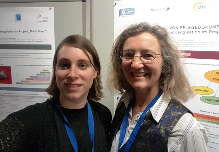 Mithilfe von vier wissenschaftlichen Postern wurden die Erhebungsmethoden des intelligenten Trinkbechers "DRINK SMART" vorgestellt. Der smarte Becher, der aus der interdisziplinären Zusammenarbeit der Departments Technik, Gesundheitswissenschaften und Pflegewissenschaft resultiert, misst das individuelle Trinkverhalten von älteren Menschen und stellt die Ergebnisse den betreuenden Pflegepersonen zur Verfügung. Zu den Erhebungsverfahren im Vorfeld zählten Einzelinterviews, Fokusgruppeninterviews, Dokumentenanalyse, Cultural Probes und Mock Up Studies. Im Workshop "Synthese einer Methodentriangulation" zeichneten die Projektleiterin Elisabeth Haslinger-Baumann und die wissenschaftliche Mitarbeiterin Katharina Gugenberger aus den Ergebnissen der NutzerInnenerhebung den Prozess nach, der zum Erstellen des Anforderungsprofils für die technische Entwicklung nötig war.