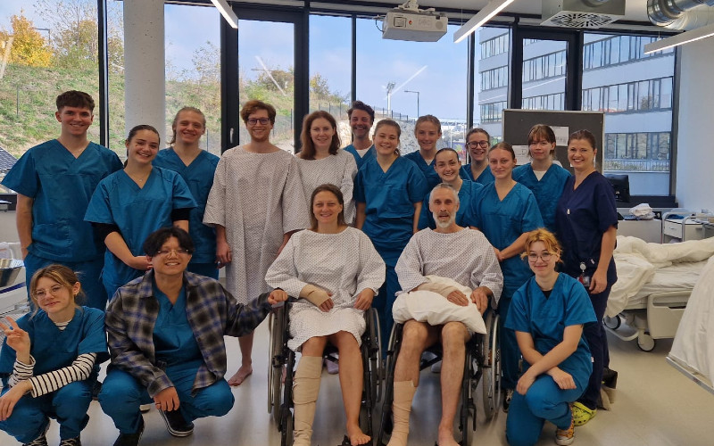 Kaum ein anderes Training ist so realitätsnah: Schauspielpatient*innen und Lehrende simulieren den Pflegealltag für Erstsemestrige. Die Studierenden der Gesundheits- und Krankenpflege haben in den ersten zwei Monaten des Studiums Fertigkeiten, wie Körperpflege, Interventionen zur Förderung der Wahrnehmung sowie Bewegung erlernt und diese beispielsweise auch aneinander geübt. Im Simulationstraining mit Schauspielpatient*innen erlangen die Studierenden im direkten Kontakt und in der direkten Arbeit mit Personen, die sie nicht kennen, weitere Sicherheit für die Umsetzung im Pflegalltag.