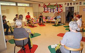 „Die bewegte Frau“ findet einmal wöchentlich im BewohnerInnenzentrum „Bassena“ in der Hansson Siedlung Ost als offene Gruppe statt. Die Besucherinnen sind Frauen der Altersgruppe 60 plus. Was die Teilnehmerinnen allesamt verbindet: wie wichtig regelmäßige Aktivität und Bewegung im Alltag sind, muss nicht erst erklärt werden, sondern stößt bei den Frauen auf offene Ohren. Im Praktikum arbeiten die Studierenden unter Anleitung ihrer Lehrenden mit den Teilnehmerinnen daran, bestimmte Bewegungen so kontrolliert auszuführen, dass alle beteiligten Strukturen, wie etwa Muskeln oder Gewebe, geschont werden. Dazu bieten sie den Frauen verschiedene Trainingsmöglichkeiten an, in denen diese lernen, worauf sie insbesondere bei Alltagsbewegungen achten müssen. Wichtig ist, die Freude an einer Lebensweise mit viel Bewegung zu fördern.