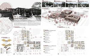 Die Studierenden Marc Handel Mazetti, Caroline Holzer und Klaus Pernsteiner von der FH Campus Wien erreichten mit ihrem Entwurf „Connected - Dach für Jung und Alt“ einen der beiden zweiten Plätze. Ihr Architekturkonzept punktete unter anderem mit einer hoch detaillierten Ausarbeitung gut überlegter Funktionalität und Orientierbarkeit, sowie Zwischenräumen, die sehr gute Verbindungen zwischen den einzelnen Bereichen schaffen. „Besonders hervorgehoben wurde die gelungene Verbindung von Innen- und Außenraum, sowie öffentlichem und halböffentlichem Raum durch das Element der Rampen, wodurch viele qualitätsvolle Orte mit hoher Aufenthaltsqualität entstehen“, freut sich Andrea Bódvay über den Erfolg ihrer Studierenden. Auch den hohen Detailierungsgrad und die klaren, intuitiv verständlichen Farbcodes bewertete die Jury sehr positiv. Die Studierenden durften sich über ein Preisgeld in Höhe von 2.250 Euro freuen.