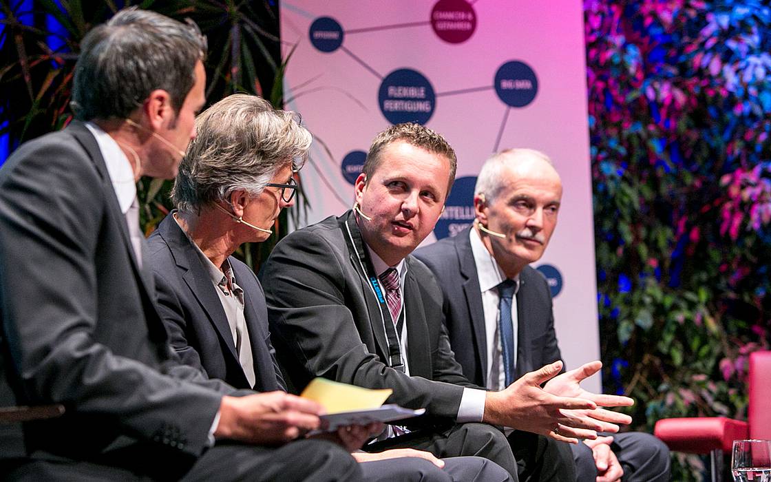 DI Dr. mont. Heimo Sandtner, Vizerektor für Forschung und Entwicklung sowie Studiengangsleiter im Fachbereich High Tech Manufacturing der FH Campus Wien diskutierte am Podium zum Thema Kooperationen zwischen Hochschulen und der Industrie. Sandtner vertrat die Ansicht, dass hier unbedingt gemeinsam am Thema gearbeitet werden muss – „unsere Tore sind offen, wir warten auf Ihre konkreten Problemstellungen im Bereich der anwendungsorientierten Forschung. Unsere ForscherInnen und Studierenden sind hochmotiviert, sie gemeinsam mit den Unternehmen zu lösen.“ Sandtner unterstrich in der Diskussion das Selbstverständnis der Hochschulen, immer neues Wissen für Gesellschaft und Industrie zu generieren und gleichzeitig flexibel zu bleiben und auf Anforderungen der Industrie rasch zu reagieren. Weitere Podiumsgäste waren Klaus Zimmermann (Experte für Lean-Production bei Festo), Dipl.-Ing. Armin Rau (Geschäftsführer Trumpf Österreich), Dr. Tobias Hinterseer (Arbeiterkammer Salzburg) und Gernot Bernert (Technischer Leiter von Hagleitner). ORF-Moderator Stefan Gehrer moderierte die Diskussion.