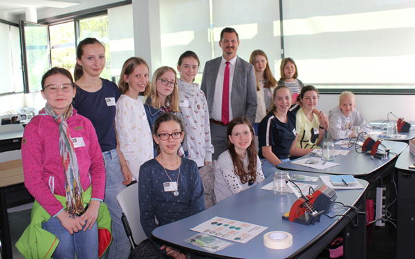 Die Teilnehmerinnen des Wiener Töchtertags an der FH Campus Wien mit Marcus Franz, Bezirksvorsteher von Favoriten.