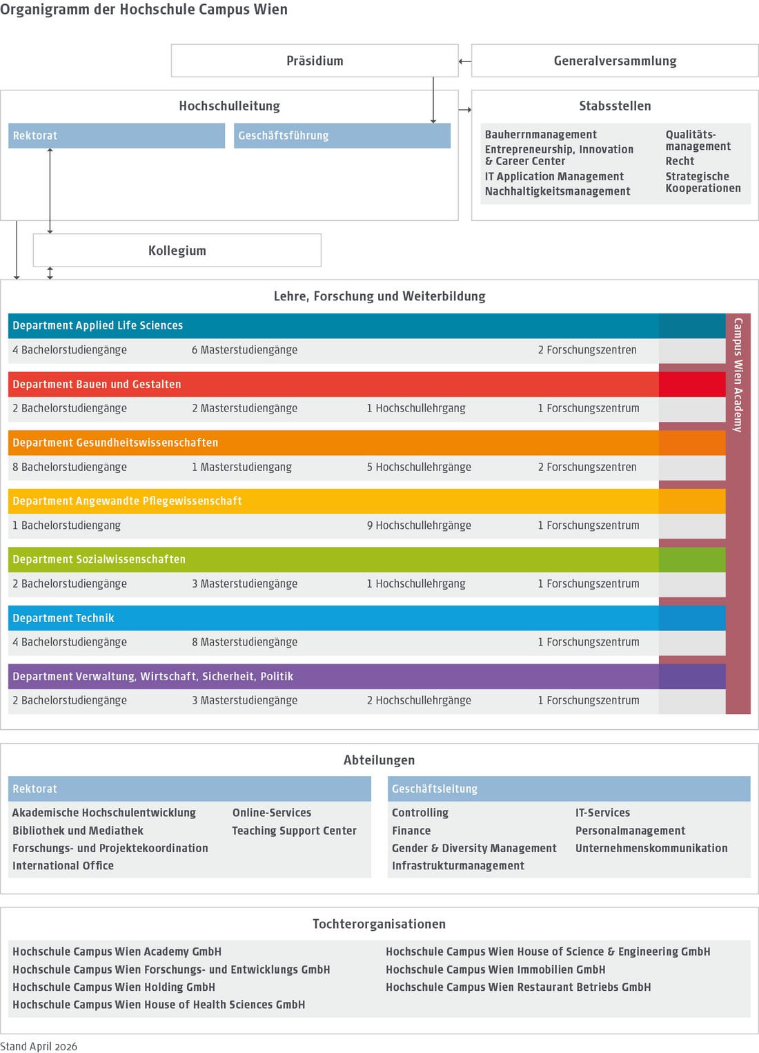 Die Hochschule Campus Wien (HCW) besteht aus Hochschulleitung, Departments mit den jeweiligen Studienprogrammen und Abteilungen. Zusätzlich sind Tocherunternehmen für Forschung und Entwicklung, Weiterbildung, Infrastruktur und Gastronomie etabliert.