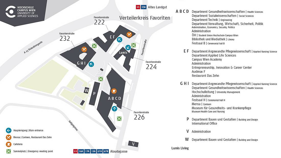 Mit der U-Bahn-Linie U1 und dem Bus 15A (Station Altes Landgut) ist die Hochschule Campus Wien perfekt an das Wiener Linien-Netz bzw. an den internationalen Hauptbahnhof angebunden. Die Nähe zum Verteilerkreis Wien-Favoriten garantiert auch eine gute Erreichbarkeit per Individualverkehr.